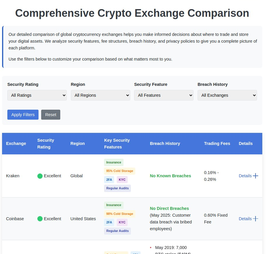 Navigating the complex landscape of cryptocurrency exchanges in 2025 requires careful consideration of security practices, fee structures, and breach history. Our comprehensive crypto exchange comparison tool helps investors identify the safest platforms for trading digital assets while minimizing costs and maximizing protection. We’ve meticulously analyzed the top global cryptocurrency exchanges—including Coinbase, Kraken, Binance, and Gemini—examining their cold storage protocols, insurance coverage, two-factor authentication methods, and historical security incidents. With over $2.2 billion stolen through exchange hacks in 2024 alone, choosing a secure exchange has never been more critical for protecting your investments. Our detailed comparison highlights which platforms employ industry-leading security measures like 95%+ cold storage, comprehensive insurance policies, and robust KYC verification processes. Whether you’re concerned about trading fees, regulatory compliance, or the security of your digital assets, our interactive tool provides the essential data you need to make informed decisions about where to trade and store your cryptocurrency holdings safely.