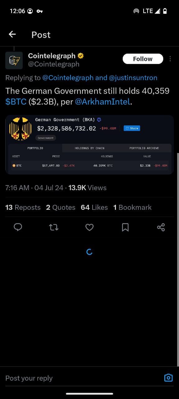 - Off-Market Purchase: By negotiating an off-market deal, Sun aims to avoid further market destabilization.- Volume and Value: Germany still holds over 40k BTC, valued at approximately $2.3 billion. Sun’s acquisition would be a substantial investment, underlining his confidence in Bitcoin’s long-term value.2. Potential Implications: