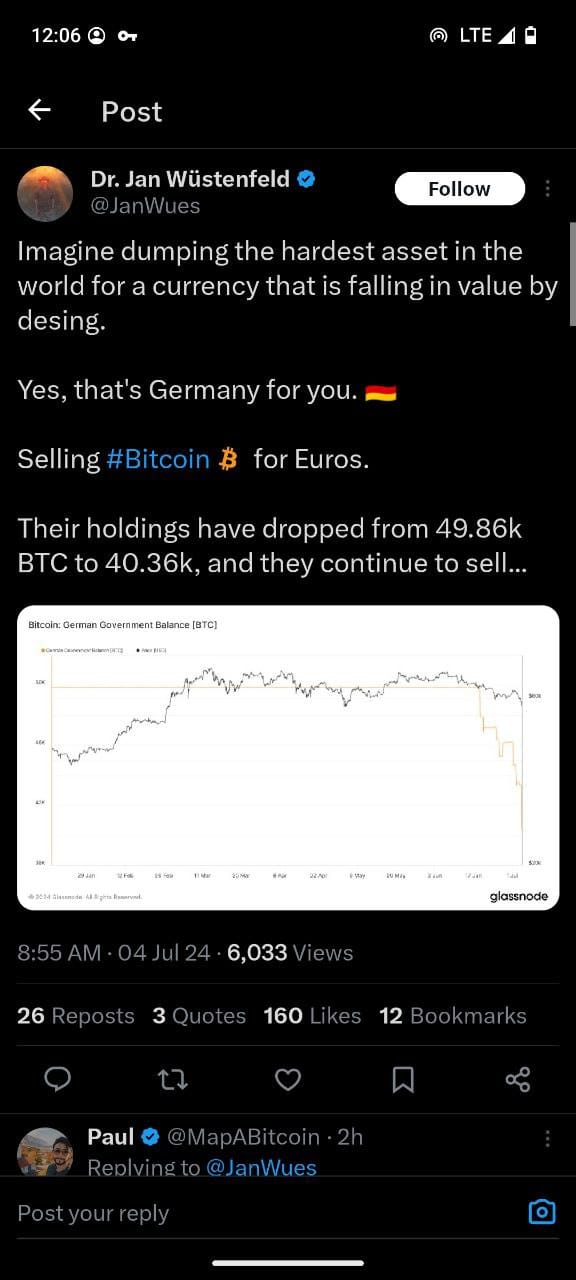 Dr. Jan Wüstenfeld’s tweet on July 4, 2024, highlighted the significant reduction in Germany’s Bitcoin holdings, dropping from 49.86k BTC to 40.36k BTC within a short period. The decision to sell Bitcoin for Euros has been met with criticism, especially as the Euro itself is experiencing devaluation pressures. This sell-off has prompted questions regarding the rationale behind Germany’s decision and its timing.